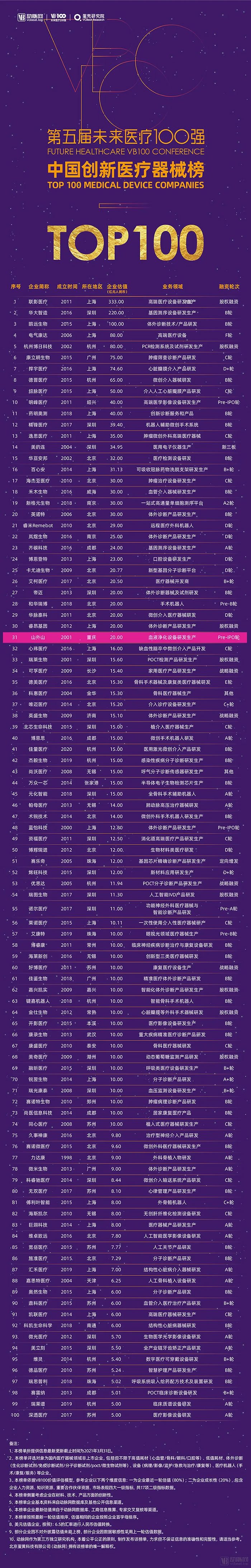 會上,醫(yī)療領(lǐng)域?qū)I(yè)服務(wù)機構(gòu)及媒體動脈網(wǎng)與蛋殼研究院聯(lián)合發(fā)布了《2020-2021未來醫(yī)療100強系列榜單》。未來醫(yī)療100強系列榜單旨在遴選真正代表未來醫(yī)療的中國創(chuàng)新醫(yī)療者,發(fā)現(xiàn)我國未來醫(yī)療產(chǎn)業(yè)的核心力量,推動健康醫(yī)療產(chǎn)業(yè)的創(chuàng)新變革進程。其中,中國創(chuàng)新醫(yī)療器械榜的企業(yè)篩選側(cè)重考慮材料、技術(shù)、產(chǎn)品方面的創(chuàng)新性。