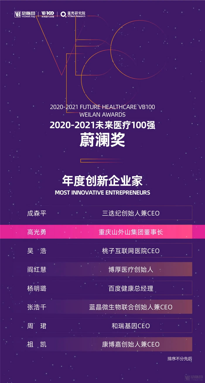 此外,山外山公司創(chuàng)始人兼董事長高光勇憑借持續(xù)創(chuàng)新求變的發(fā)展理念,獲得“2020-2021未來醫(yī)療100強·蔚瀾?yīng)?middot;年度創(chuàng)新企業(yè)家”榮譽。捷報連連,再次體現(xiàn)了山外山公司在醫(yī)療器械產(chǎn)業(yè)的前瞻探索和卓越創(chuàng)新獲得業(yè)界認可。