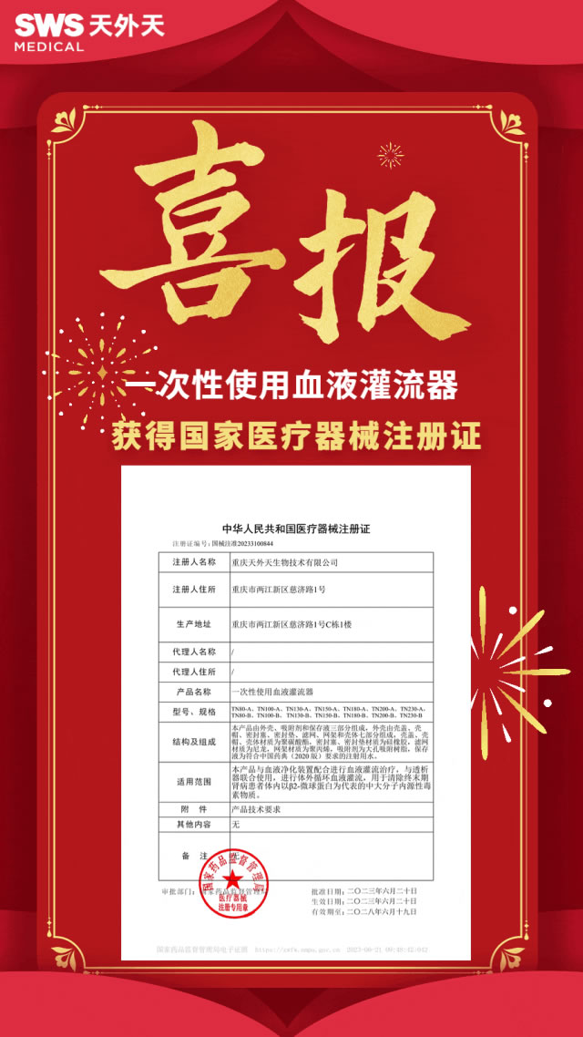 近日,重慶山外山血液凈化技術(shù)股份有限公司(以下簡稱為“山外山公司”)全資子公司——重慶天外天生物技術(shù)有限公司自主研發(fā)的“一次性使用血液灌流器”成功獲得由國家藥品監(jiān)督管理局頒發(fā)的《中華人民共和國醫(yī)療器械注冊證》,成為推進山外山公司全產(chǎn)業(yè)鏈布局的又一重要節(jié)點。