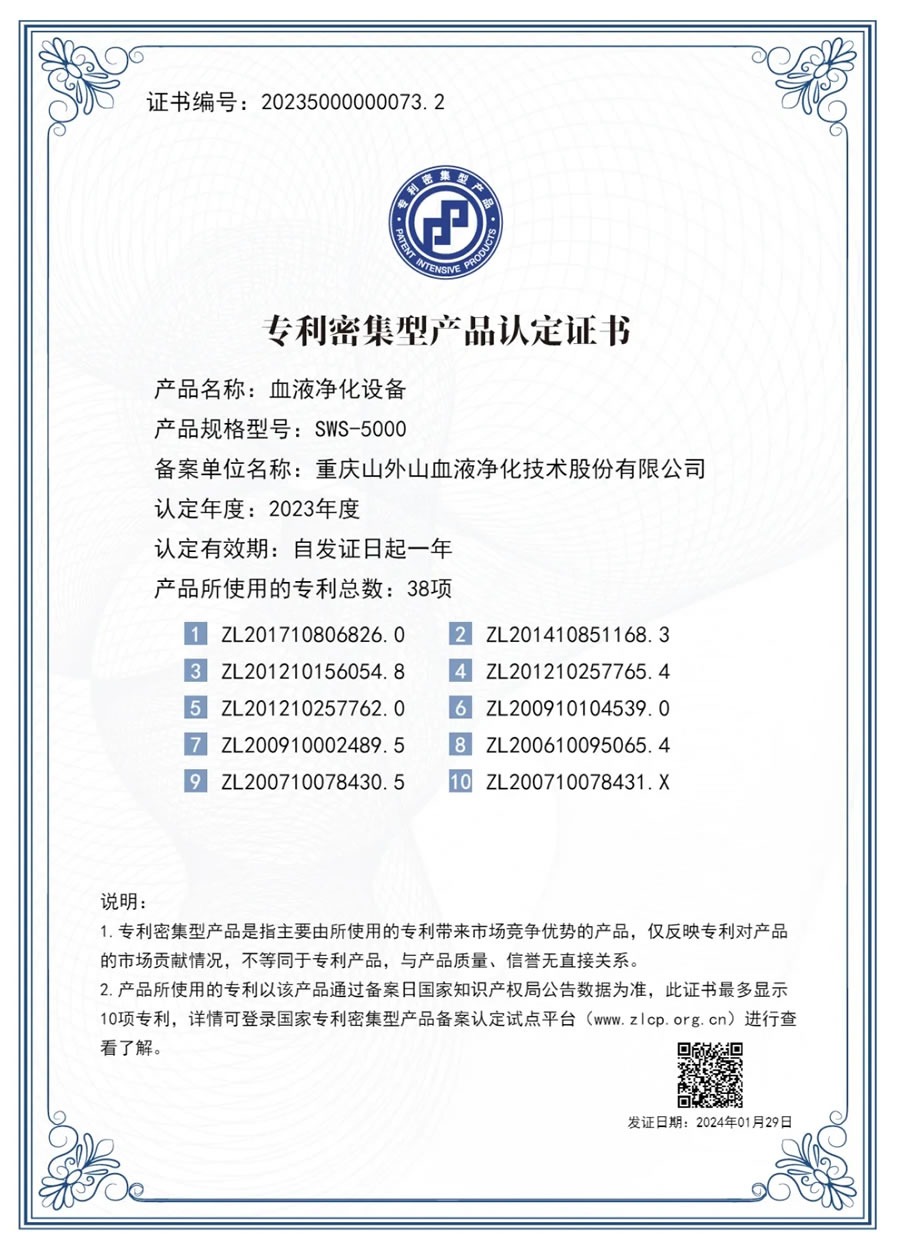 “首臺(tái)(套)重大技術(shù)裝備產(chǎn)品”及“專利密集型產(chǎn)品”的認(rèn)定,是對山外山公司技術(shù)創(chuàng)新能力的一種肯定,也代表了公司產(chǎn)品在血液凈化行業(yè)的技術(shù)領(lǐng)先地位。