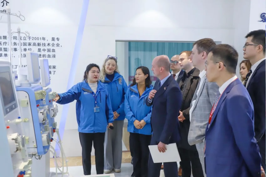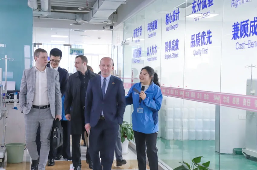亞歷山大?波德科維羅夫公使參贊一行在山外山國(guó)際營(yíng)銷團(tuán)隊(duì)及公司高管帶領(lǐng)下,參觀了企業(yè)展廳、研發(fā)中心及智能化生產(chǎn)線,詳細(xì)了解了山外山在血液凈化設(shè)備、耗材研發(fā)及血透智能大數(shù)據(jù)方面的核心技術(shù)與創(chuàng)新成果。